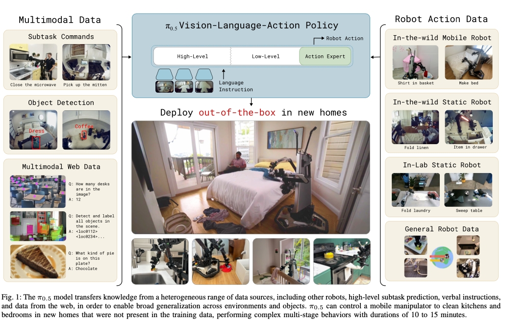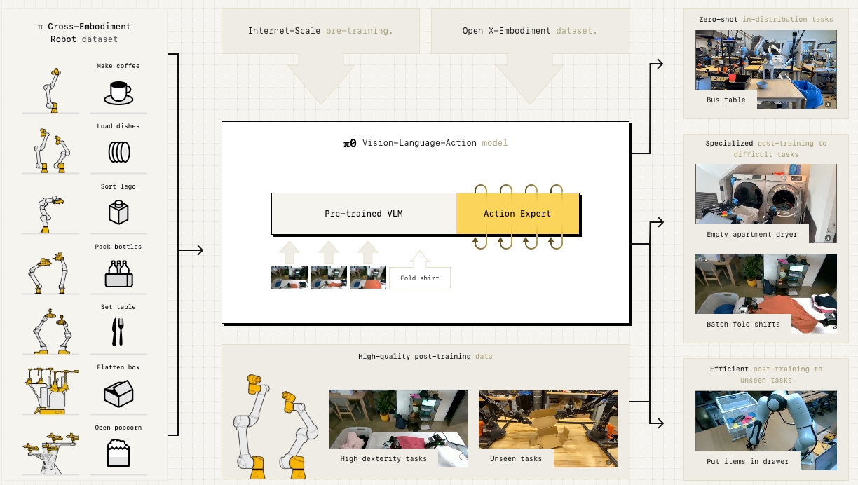 pi0 (October 2024), also written as π₀ or pi zero, is a a flow-based diffusion vision-language-action model (VLA) by Physical Intelligence. The weight of pi0 are open sourced on Hugging Face. Learn more.pi0 FAST (February 2025), also written as π₀-FAST or pi zero FAST, is an autoregressive VLA, based on the FAST action tokenizer. Similar to how LLMs generate text token by token, pi0 FAST generates actions token by token. Learn more.pi0.5 (April 2025) is a Vision-Language-Action model by Physical Intelligence that focuses on “open-world generalization.” It’s designed to enable robots to perform tasks in entirely new environments that they have not seen during training, a significant step toward creating truly general-purpose robots for homes and other unstructured spaces. While the research and results are public, the model itself is not open-source.