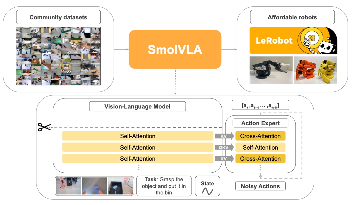 SmolVLA (June 2025) is a small, open-source Vision-Language-Action (VLA) model from Hugging Face designed to be efficient and accessible. It was created as a lightweight, reproducible, and performant alternative to large, proprietary models that often have high computational costs. The model, whose weights are available on Hugging Face, was trained entirely on publicly available, community-contributed datasets. It’s a 450M parameters model, trained with 30,000 hours of compute
